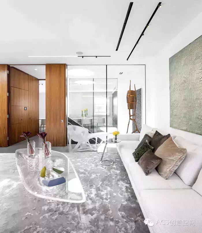 这是伦敦一座清新淡雅的复式住宅,推开门,映入眼帘的是一艘船行驶在波涛汹涌的海面上,有没有特别的激动,你在起居室居然也能看见海浪!这是地毯颜色、形状给你的错觉,你看白色的墙壁上似乎有一块皲裂的黄土地呢?这就是设计师充分利用艺术来吸引我们的眼球!