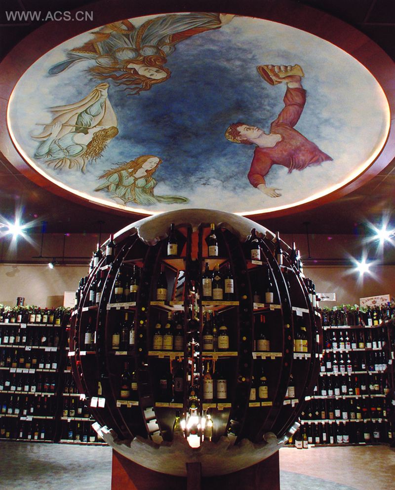 液态星球咖啡馆和酒品商店位于蒙大拿州米苏拉市。定制及制造全球硬木层压板。墙后面的商业展示架是由优质的红木制成,红木被涂上了深红色。天花板上的壁画是由米苏拉当地居民哈德利·弗格森绘制完成。