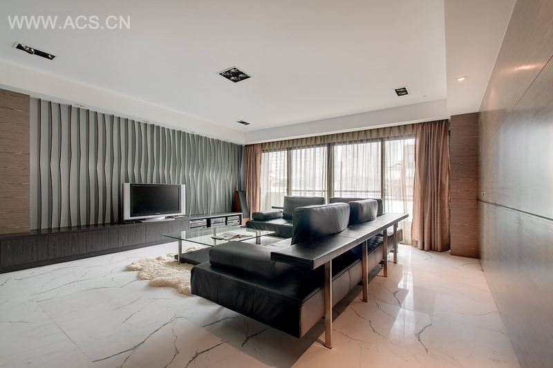 房子从门口开始一分为二。主人的卧室和客厅都在南方,孩子们的房间和餐厅在北方。功能划分明确,等级不互相干扰。设计师用简约的弧线连贯公共区域,加强横向延伸,尽量拉长视觉,扩大过道空间,让人倍感舒适,通过多层次简聚集的风格创建出一种流动的自由生活方式。实木是用来隐蔽客厅的主卧室,滑动的玻璃门是为了松紧空间,主要的墙面是由弯曲玻璃切割面做的,就像时光流动,让房子有一种精致的变化,设计师的自然原始设计理念,既遵循生活的简单又能感受生活的美丽。
