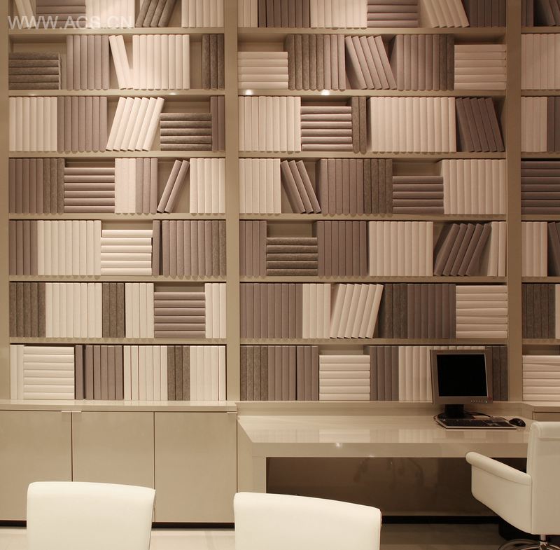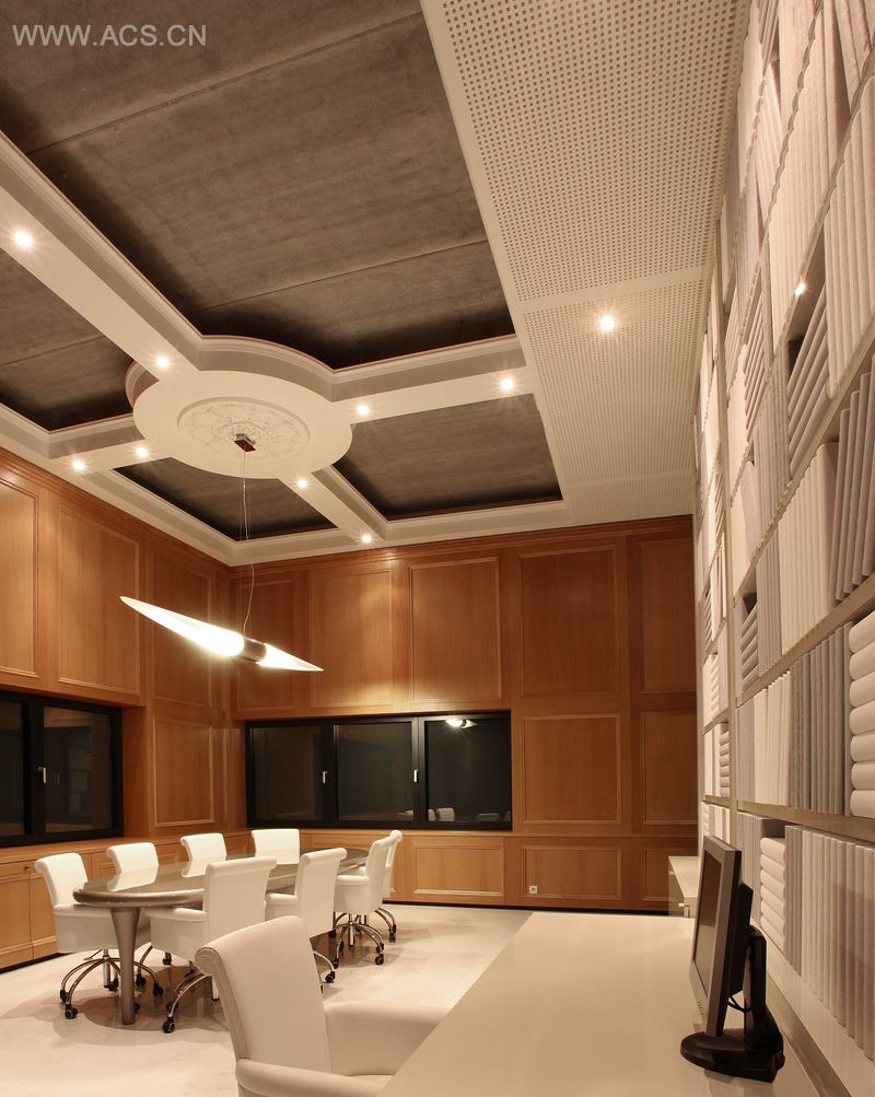 在主会议室,无装饰的楼梯由缆线连接。桌面逐渐延伸,形成定制办公桌。木制桌台为工业型办公室增加温馨氛围。一面墙壁以书籍作装饰,兼作音响。混凝土天花板周围加有复古缘口装饰线条。空间充满对比和创意元素。