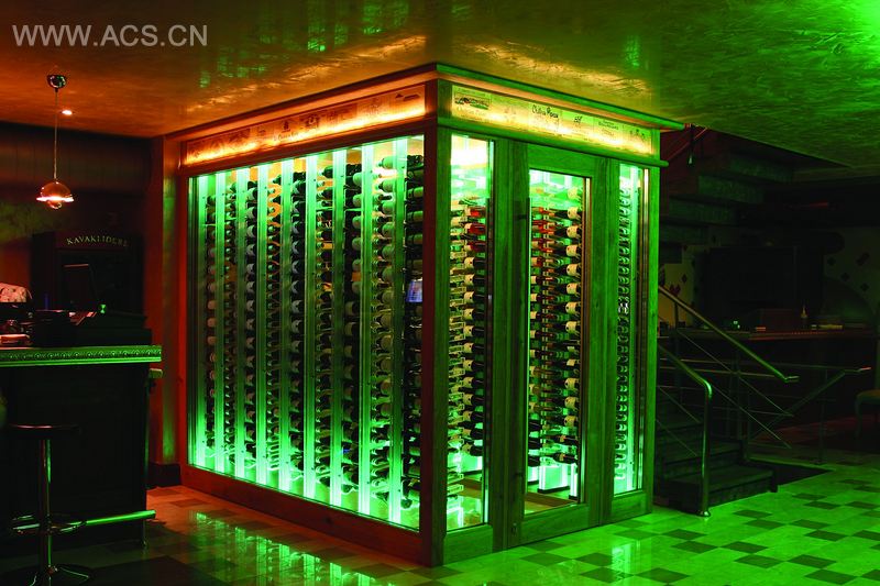 这个酒窖位于意大利餐厅——潘尼欧·朱斯托餐厅及咖啡馆——一个最突出的位置,像是三个立面大玻璃窗里隐藏的宝藏。第一眼看上去感觉整个建筑都是围绕着酒窖而建立。餐厅的客人们可以跟着调酒师在酒窖里随意走动,从600瓶酒中挑出一瓶自己喜欢的。酒窖的外部用原酒箱面板制作成的一个冠加以装饰。