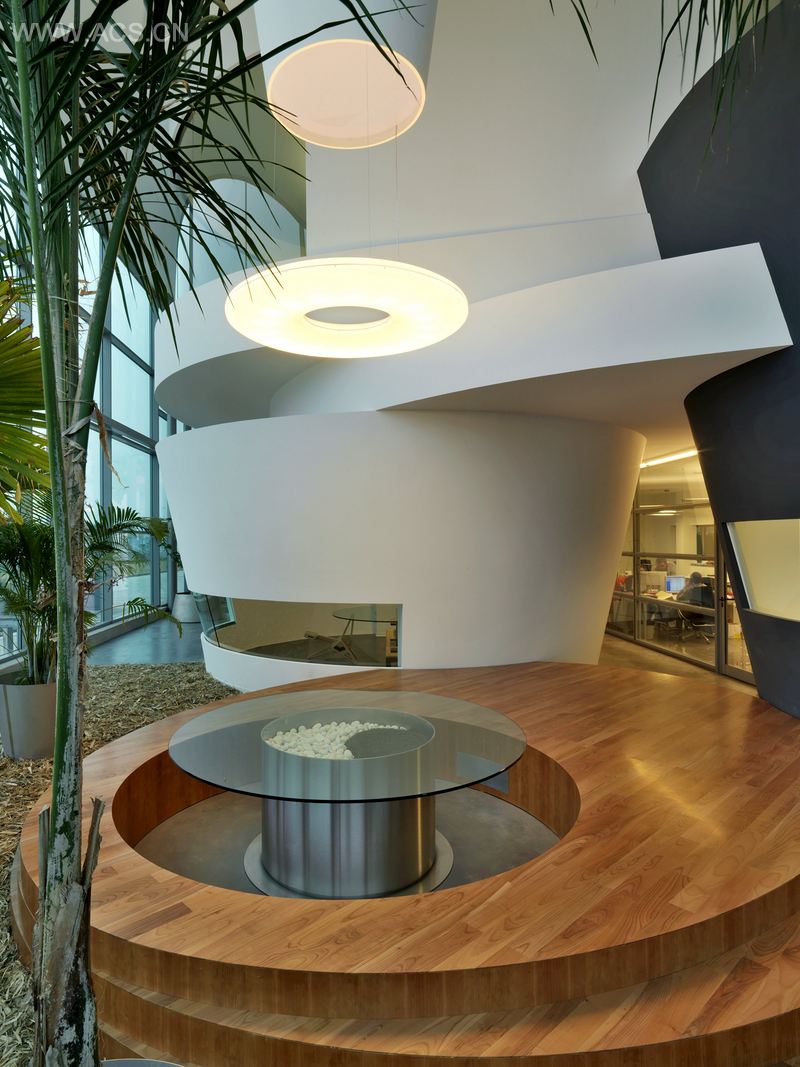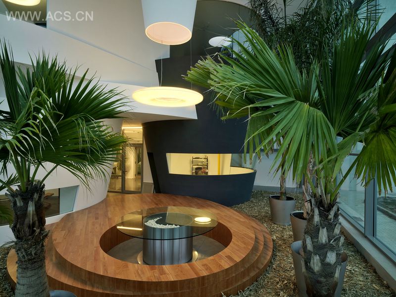 白色缎带被锥形楼梯隔开,人们得以走出旋转路线,进入会议区。会议区由绿植和木制平台构成,强调着项目的核心精神:人本、舒适、阴阳协调。