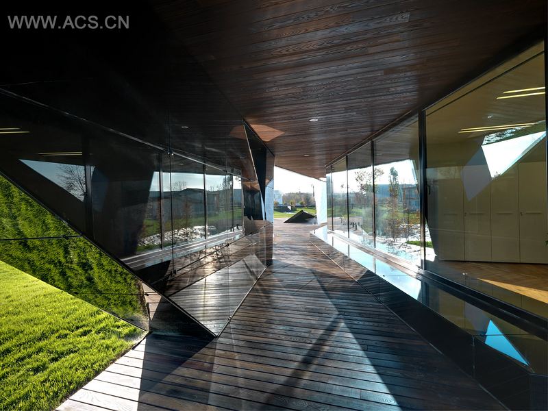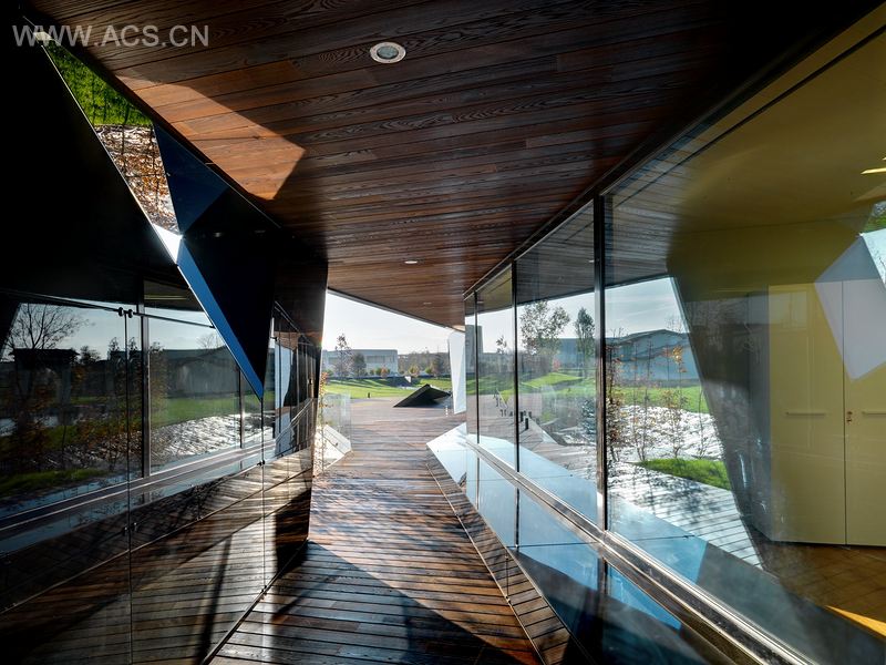 室内空间作为外部结构的延续,表现为多层次的四个交错空间,配以不同切面的窗户。