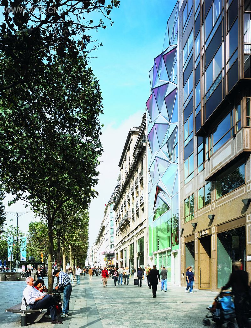 在街道处,极简抽象风格的玻璃立面展示出了严谨的平整度和大块矩形玻璃的设计运用,V形符号的引入传达了一些更为新颖的设计符号,上面有菱形、三角形及V形符号。这座建筑越往高处看就越具有三维效果,上面的棱镜设计给整个设计赋予了新的深度。最后,新建筑的顶部就像是一个绝妙的玻璃雕塑,它的复杂造型会让人想起日式的折纸手工。V形符号仍然出现,但越往高处,其呈现方式也越为谨慎,它逐渐变得难以界定,而且更多的是以整体的形式出现并几乎达到了难以察觉的效果。这个令人振奋的项目是一个介乎于建筑和精致艺术雕塑之间的作品。