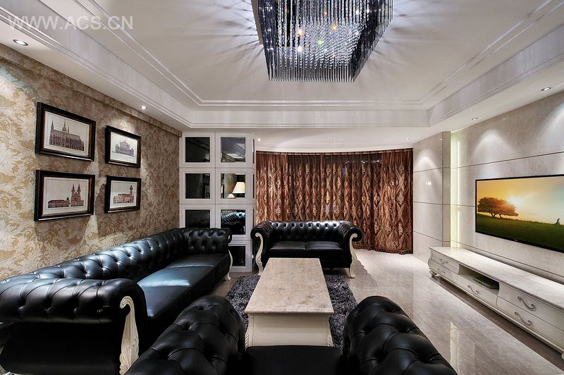 综合这些情况最终确定以简欧做为设计的主方向,设计所有的造型线条以直线条为主 并尽量以多层次为主 来营造出欧式的线条层次感 在为了体现一种低调奢华的感觉所以采用了黑金色系 一个经典的搭配色彩搭配,结构上沙发边上的原始简力墙是一个非常大的原始结构问题 为了让客厅看过去更加完整 所以采用了护墙板搭配镜面的手法 让空间得到一种整体的释放 让人的视线的视线延伸进去 由于镜面有反射效果 墙面会让客厅变的更大。