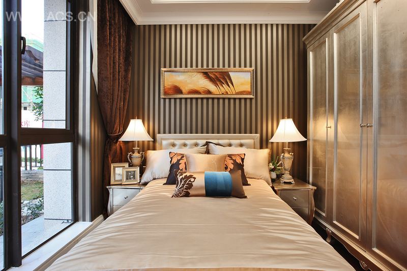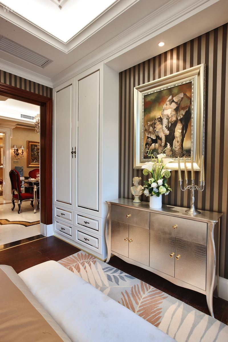 主卧空间,内敛而低调的浅咖啡色,优雅而不失品位。床帏的方式,以及家具中隐隐可见的优美线条,让人能够感受到隐藏于此的女性气息。另一侧的书房则完全为男主人打造,深色的书桌椅和沙发,硬朗、粗壮的线条营造出男性的味道,为了不让空间显得过于拘谨和庄重,花艺与油画的注入起到了很大的缓和作用。