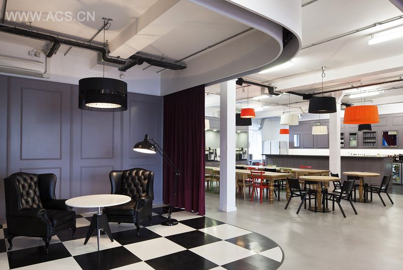 餐厅白天对所有员工开放,晚上则成为酒吧,可举行办公室派对。