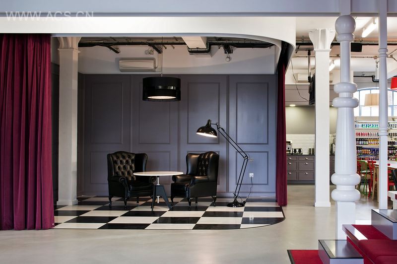 楼梯旁边,紫色及地天鹅绒窗帘呈弧形悬挂,帘后是一系列功能区,包括音响室、台球室、电脑游戏室,供员工在工作之余放松身心。