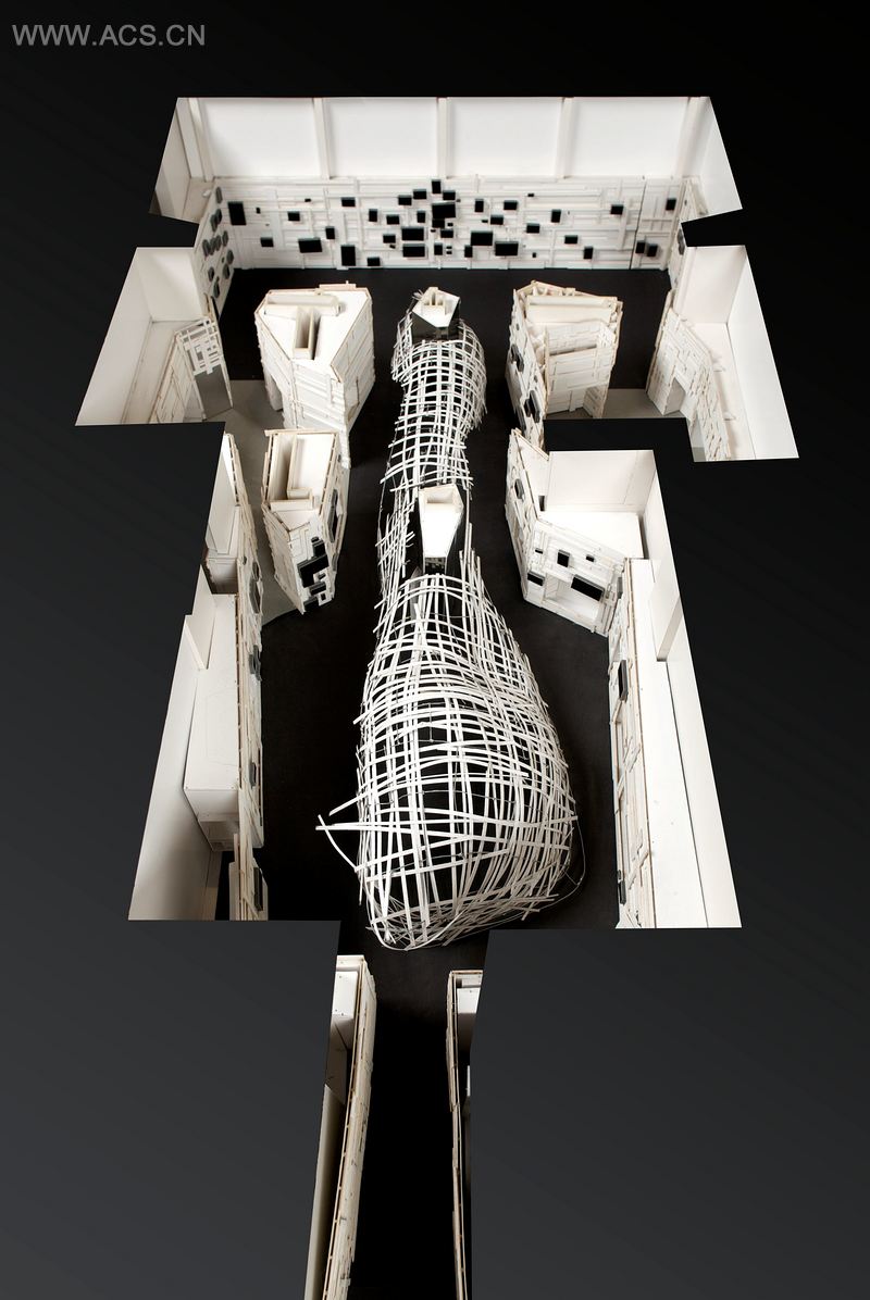 走进其中,人们会立刻被建在原处的一个装置所吸引,这个装置由艺术家阿纳·奎兹所设计,这是一个用防滑钉和木板条编织而成的装置,它是一个处于极度拉伸状态之下并保持平衡感的装置。屋顶的空间变化引领着客人们前进,这里就好比是一个公共论坛空间,人们可以在此聚集、交谈,甚至可以休闲地坐下来阅读一本好书。这个空间指导着人们迈步,它鼓励着参观者进一步地去探险。