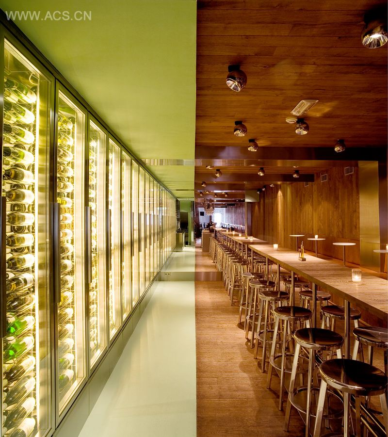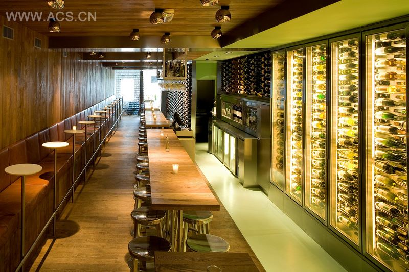 Vyne由两部分组成。右侧的是“棕色咖啡馆”,有着橡木地板、墙壁和天花板,还有靠在墙上的长棕色皮革沙发。这间客房是让人联想到经典的法国葡萄酒,橡木地板让人感觉自己像是坐在大酒桶上。左侧是一个酒库,整面墙都是由不锈钢制成,摆满了酒瓶。有来自非洲和澳大利亚新酒,都是利用现代技术生产的。长形酒吧桌放置在中央,提供一个舒适、动感、活泼的气氛,可容纳将近100人。 Vyne的厨房里面有一张“厨师桌”可用来品酒。
