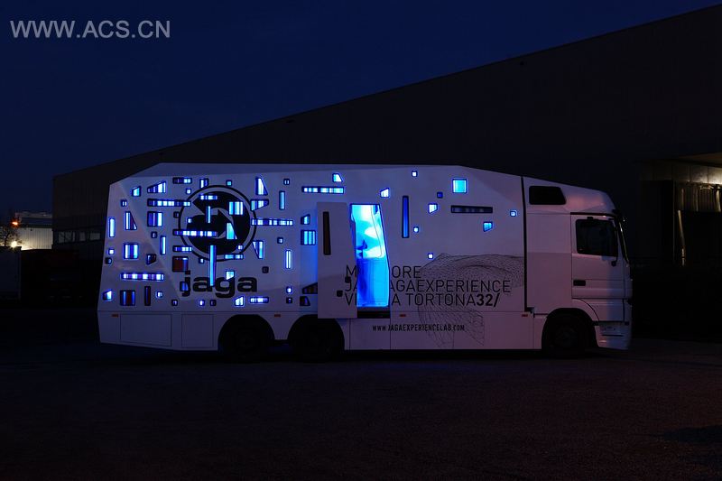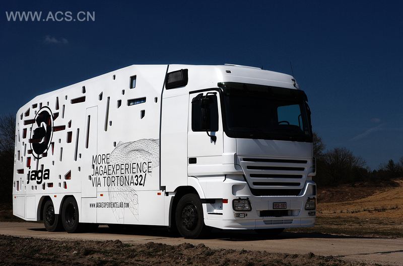 这也就是这款体验式货车的灵感来源。货车底部有一个8吨的载重汽车底盘,SAQ工作室为这辆货车设计了一个全新的车身,里面包含了一间放映室、一间VIP休息室和一间厨房。