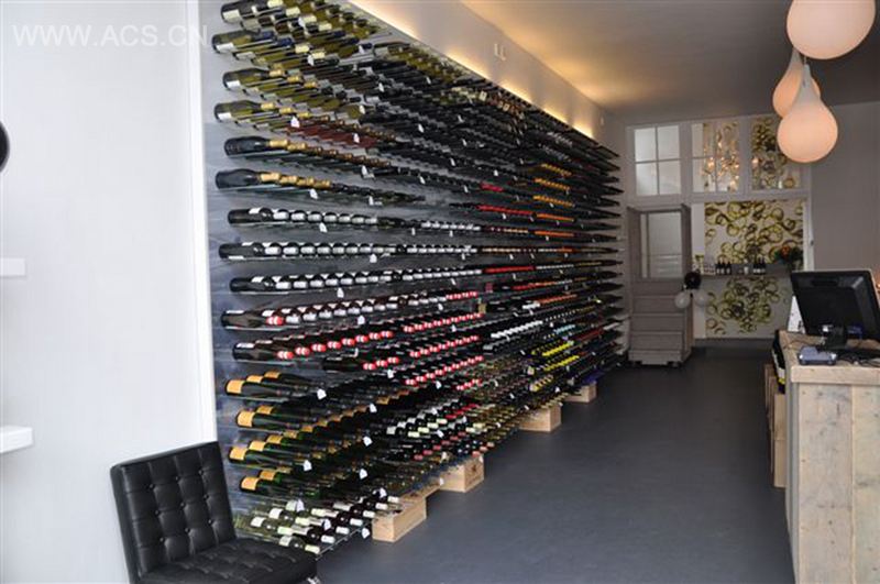 伊夫琳·博克为E-CRU——荷兰阿尔克马尔一家葡萄酒专卖店——设计了一个“酒墙”。这个容纳了超过1000瓶葡萄酒的传统木质酒窖有着简单而又新鲜的存储系统。一个中密度木纤维垫板表面上有法国葡萄园的黑白图案,支撑着U型架的最低处,让人感觉储藏的葡萄酒瓶盘旋在墙上一般。搁架不再是墙的装饰物,留下一排排的酒作为“酒墙”仅有的展示品。