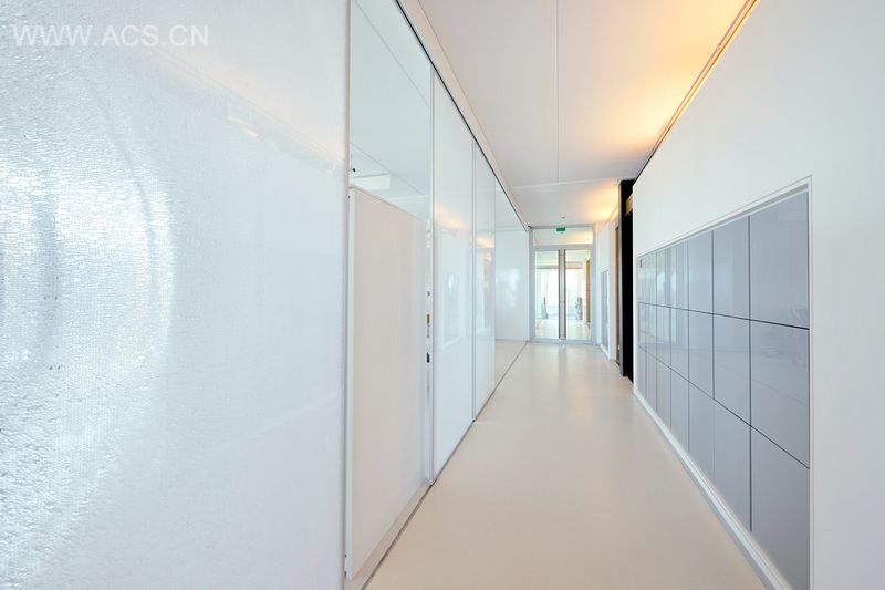 上层区域也有两层,是可灵活分割的空间,附设高科技设施。活动办公室为员工提供高质量的最佳工作条件,增进内部沟通和合作。透明、循环、私密、公开,彼此平衡于有序高效的系统分区,创造出多个开放和封闭办公空间。宁静与热闹在空间转变,员工在走廊增进交流,办公室成为高质量的会议场所。材料、色彩和光的运用,均自然而精确,带来优雅、友好的气氛,整个空间呈现平衡之美:装饰给予机构本身生命与活力。