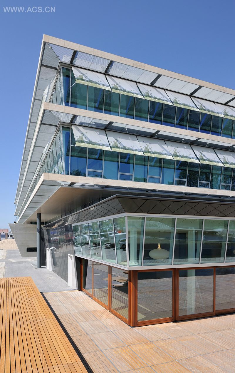 可持续性是设计的主线,以技术或物质的形式体现,辅之以水的运用。较低的两层显示出开放式布局,宽敞、简单、功能齐全。地面层是开放透明的公共空间,又有封闭高效的配套设施。氛围是多样的、有表现力的、景观式的。