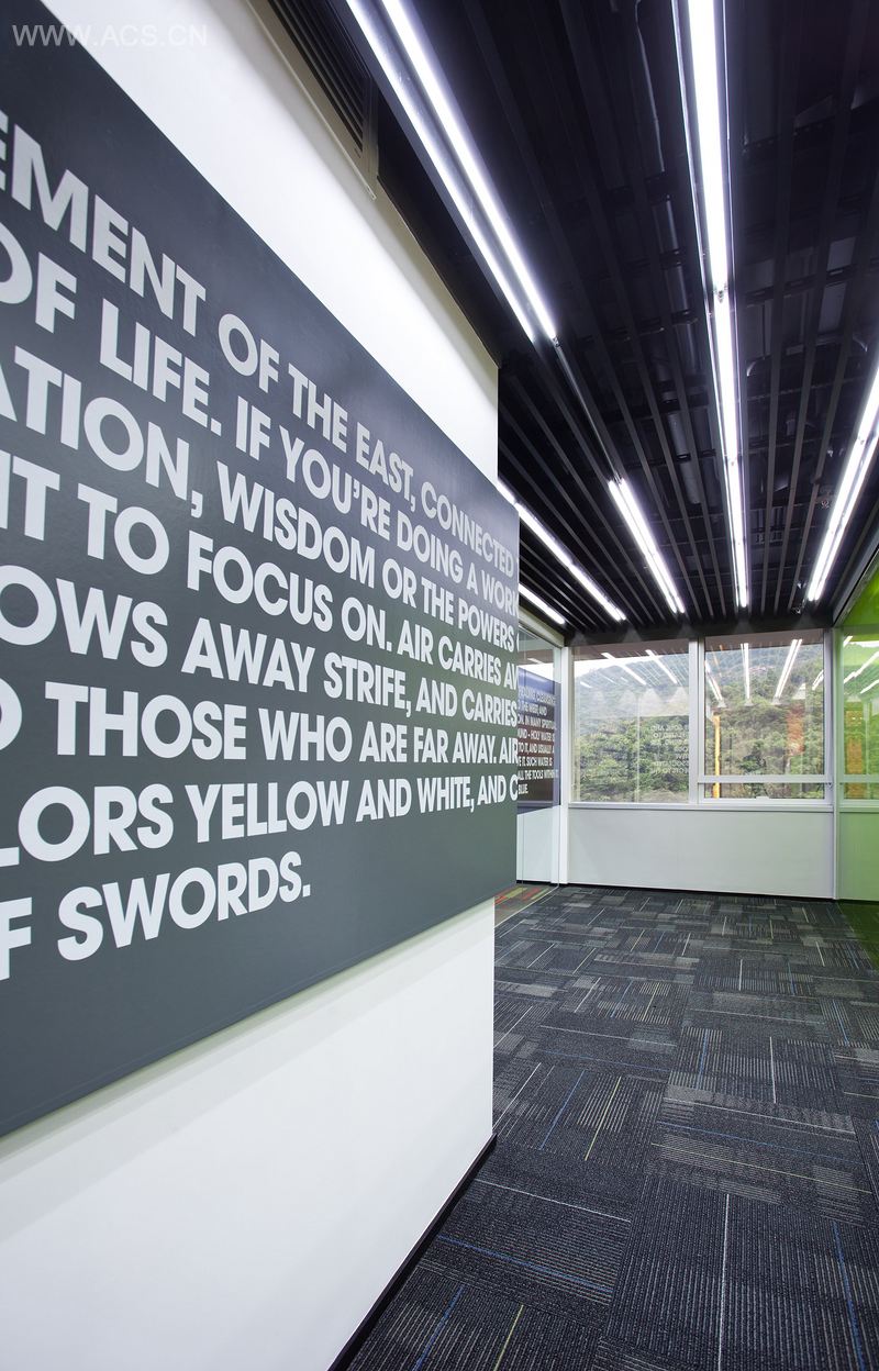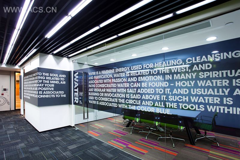 XSS总部的设计创新而前卫。线条和几何形状交织分布,搭配精挑细选的地毯图案,产生线性透视,拓展现有空间。会议室被划分为多个独立的小区域,沿中心区向外分布。设计的出发点在于,力求团结各员工,营造融洽氛围。每个房间都有一个不同的设计元素。色彩的运用以及写满墙壁的激励语,都为工作空间营造乐观氛围。