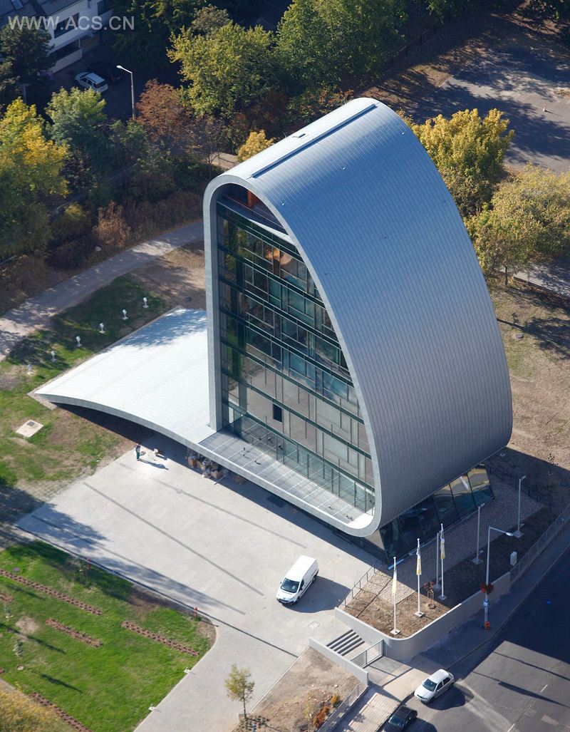 主大厅和功能区设在一楼,最顶层弧线下是一个屋顶露台,可以举行会议。循环缎带有1米厚,宽度和形状随高度改变。材料的使用也值得一提。一是以金属包裹、没有开口的缎带,一是覆盖建筑全身的玻璃幕墙。建筑装有地热能源系统,使得屋顶不再需要安装技术设备。