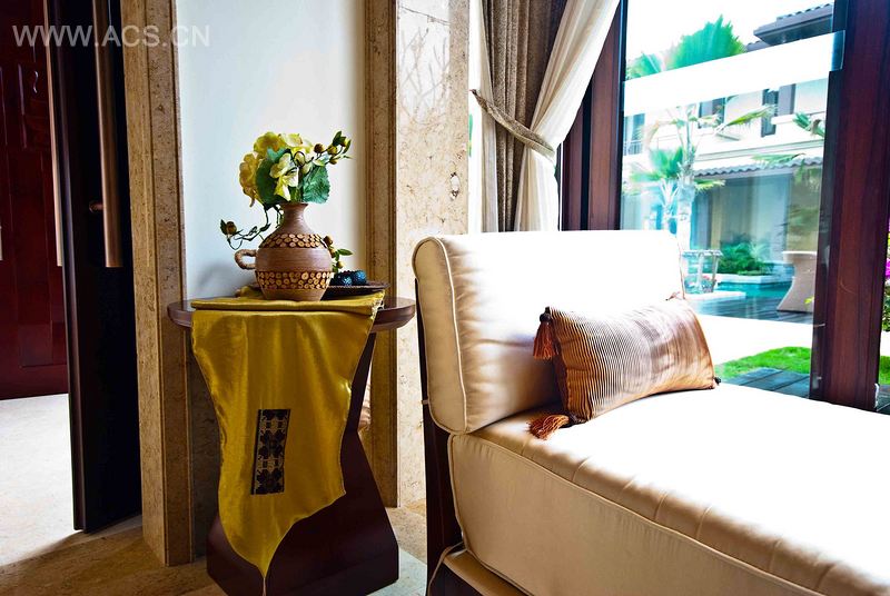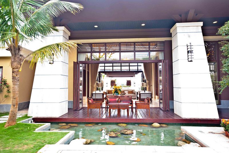 因地处热带海岛,故建筑风格以现代东南亚的风格处理,而室内部分则顺应市场定位,在现代东南亚风格的基础上融入了一些金、银、铜等装饰元素,表现贵族奢华,予以空间丰厚张力的同时还结合了园林用材的表达,使其奢华中不失休闲感,与周边环境融为一体。