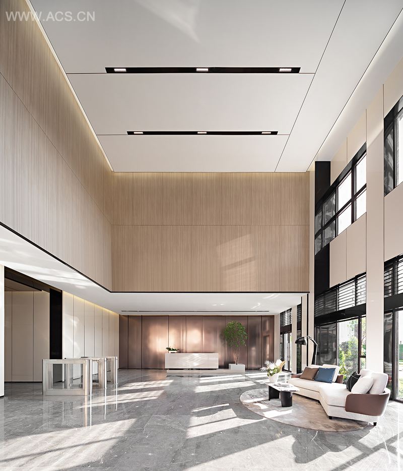 直角区间作为共享会议区,以项目环境为大背景,提供开放式会议的场所,仿水磨石地毯与原木色墙体营造出精致的轻商业氛围,搭配多功能的沙发座椅,在满足会议交谈功能的同时,呼应项目的时尚商务调性,柔和地将多种功能结合起来。