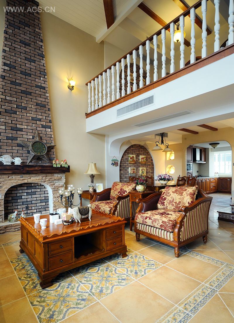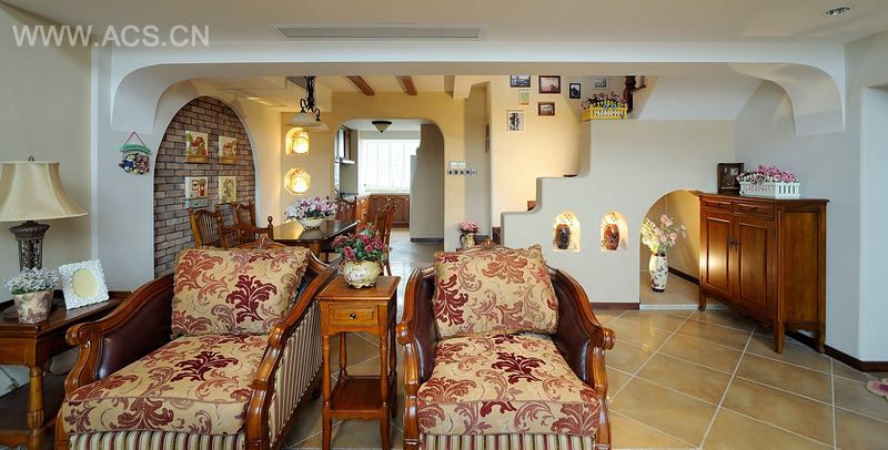 整体空间以各种充满田园气息的材料来表现:仿古砖、实木家具、真石漆、花卉图案壁纸等的运用让空间充满原始、自然的味道,加上古典吊灯、陶瓷、插花绿植的点缀,让人心动。