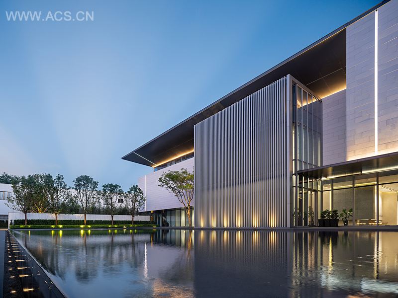 结合水乡的特色,展示中心入口处设置了一池镜面水景,建筑倒影在水面上,与周围环境融为一体,打造出唯美的水乡意境。