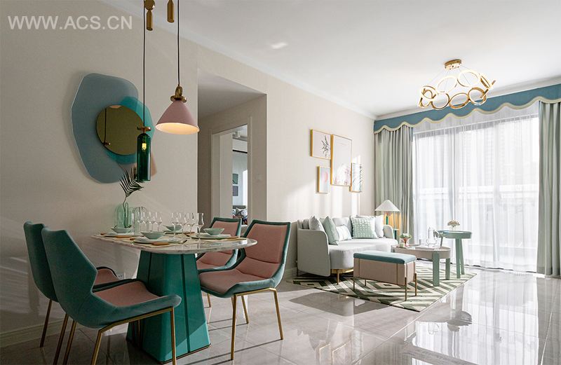 介于蓝色和绿色之间的薄荷绿,是一种非常清新而又高雅的颜色,既有浅蓝色的纯粹与宁静,又有绿色的活力与生机。设计师将薄荷绿作为空间的主题颜色,穿插于灰白色的空间之中,不仅能让整个家居显得清爽透亮,纯度适中的清爽色系还有一股源于自然的治愈力量,能舒缓人的心情。当浅粉与雅金等几抹温暖的跳色,与经典的薄荷绿冷暖交叠,再搭配上暖色调的灯光,便创造出温馨宁静、健康自然而又优雅时尚的生活氛围。