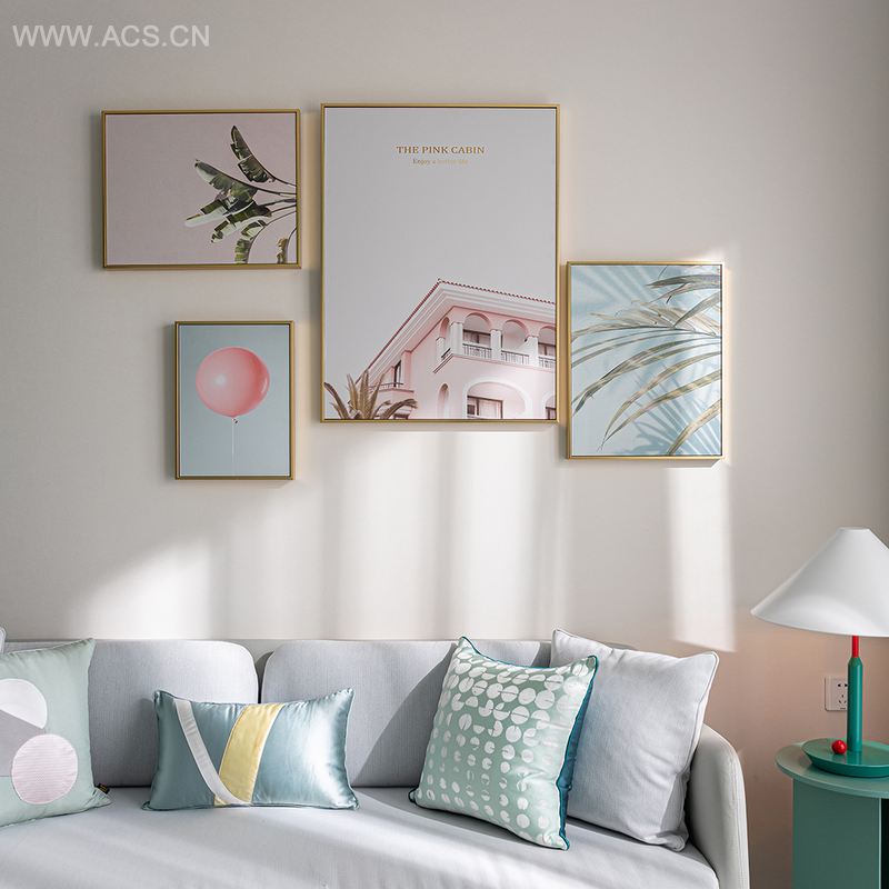 一幅富有艺术气质的现代装饰画,偏移摆放在沙发背景墙右侧,营造出一种不平衡的设计美感。