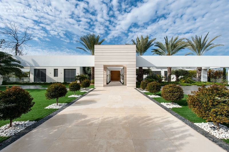 The building’s concept is an integration with the natural landscape in the area and in the plot, while creating a dramatic entrance façade that is still restrained and mysterious toward the street. Instead of highlighting the large and regular windows, and the doors, the idea was to hint at the building by creating two concrete beams with a line of trees between them. Between these stands a columns arcade which lead to the entrance hall, with an ornamental pool on both sides of the path. The entrance to the building, through a patio as a fruit tree orchard, constitutes a pause before entering the house and creates a work for the building, built of s of walls and partitions.