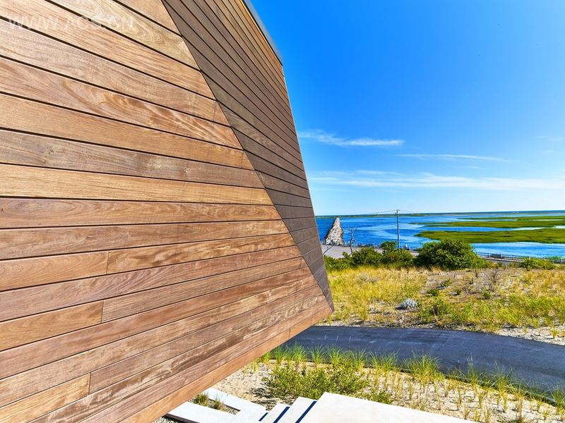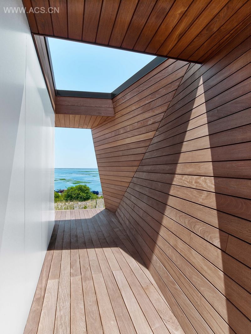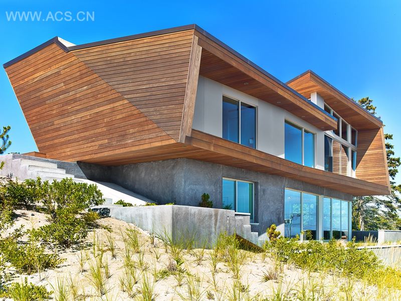 这个222.96 平方米的住宅位于优美的普罗文斯敦较远的一端,筑造于沙丘之上,面向一个盐沼和一个1 609.344 米长的石砌防波堤。住宅采用两层结构,共有着3 个卧室,开放、前卫风格的起居室、餐厅和厨房,一个大露台以及露台之上设有阳台。结合城市7 米的限高,设计师利用地形的轮廓和曲度在建筑和场地间创造了一个舒适又亲密的关系。