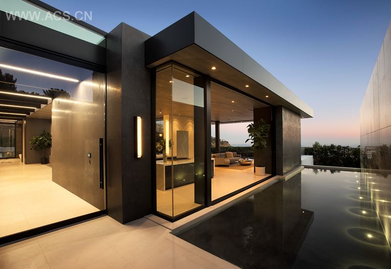 项目最大的难点在于隐私问题。借助一堵华丽的大理石墙面,我们成功地将该建筑的临街面遮挡开来,并且打通了连接厨房的水院入口。而开闭式间壁和线性天窗的使用则为该建筑创造了良好的采光条件。通过与琳达·默里室内设计师事务所强强联合,我们利用各种石材和木质天花板营造出一种温馨自然的氛围,使人感觉宾至如归。而建筑主层,水塘之水汇入下层的水景之中,水景紧紧围绕着基层娱乐区的篝火。池中的天窗是本建筑的一大亮点,阳光通过天窗,使人们可以欣赏到泳池底部的美景。