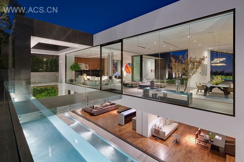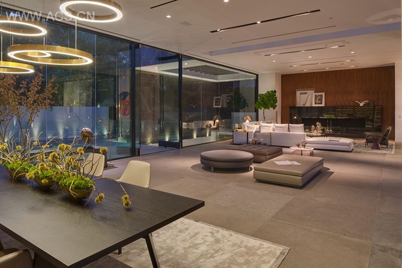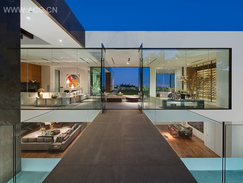 该项目位于塔那戈尔,是我们在这个小巧繁忙的西好莱坞街道上设计的第三个项目。其位于街道尽头,周边风景旖旎,是绝佳的选址。而角落处,行人入口与车辆入口自然天成,相互分离。而我们最担心的便是如何实现建筑面积与下方城市风光的平衡。为了兼顾这两个方面,我们在设计中将单层建筑建在基层之上,而基层设计的关键则在于寻求最佳采光效果及用户宜居的空间设计。通过线性光井技术,我们成功地将街道与住宅分离:站在街道上,人们只能看见两堵大石墙间的入口。而一旦进入其中,人们便能经过光井上的桥梁及水景,通过那透明的空间设计看清全貌。