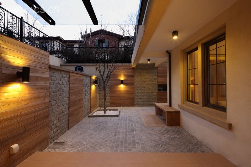 本项目位于北京顺义区后沙峪区域,面积490平方米,共有三层。庭院,都是“自然”的结合,地面由烧结砖铺设,墙面运用炭化木和文化砖结构搭配,配合投射灯,带给了空间安静与优雅。