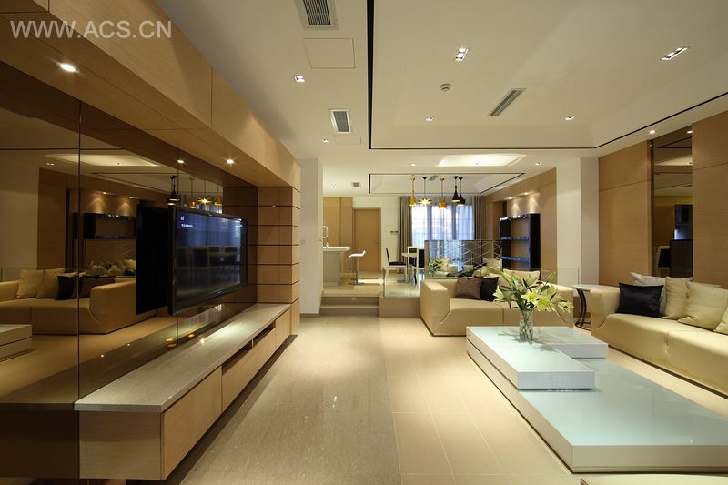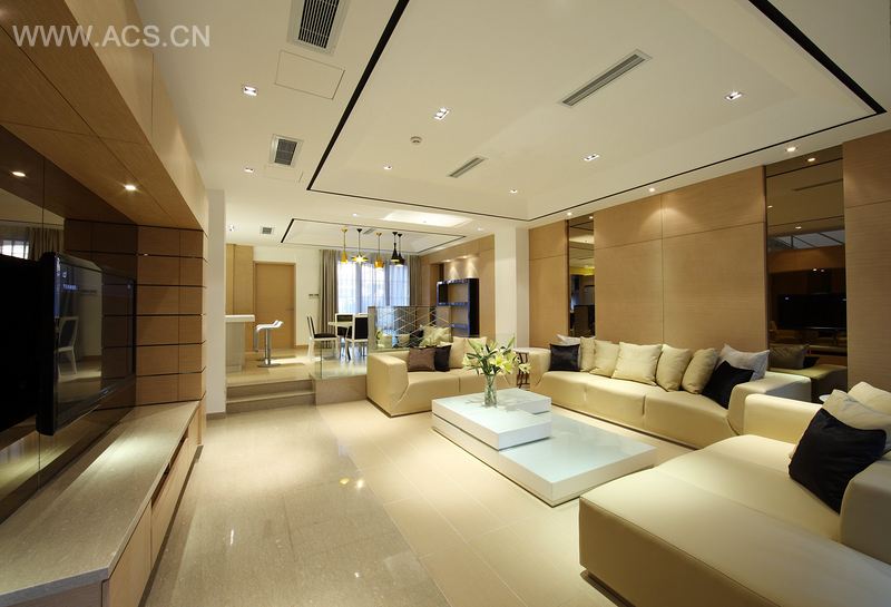 进入一层起居室与休闲区域,大幅面的暖色调运用,以宁静温和的姿态,让归来的人感到温馨与舒适。沿着千丝万缕石材定制的踏步拾级而上,步入二楼的区域是集客厅、中餐厨房、西餐厨房、餐厅空间为一体的开放式公共空间,主体区域为客厅,整个大空间通透开放;电视背景墙由橡木板材料制作的储物柜配合茶镜玻璃材质所组成,结合了装饰性与功能性双重特质,这也成为了此案主流风格的体现;客厅吊顶结构的处理延伸了视觉感,周围是宽度为5厘米黑色凹槽,这对施工精细度有着十分高的要求。步入三楼,在主人卧室设计中,睿智匯设计师同样采用了纹理自然而清新的橡木板材与颇具现代感的茶镜材料拼接使用,用现代的表现手法将其诠释,展现出温和宁静的氛围,让人的心灵得以畅然的意境。