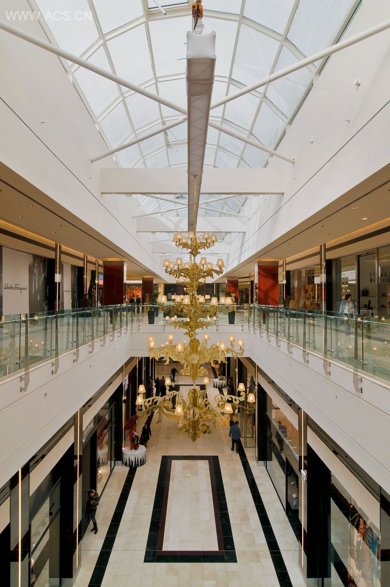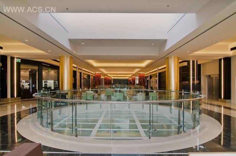 正门进去是购物中心的主广场,它的露台能为广场带来自然光线。作为一个娱乐和休闲空间,为人流准备了咖啡馆等。高耸的柱子能突出整个商场和它的玻璃屋顶。电梯外则覆以反光镜,看起来较轻盈。就像宏伟的大门一样,柱子也采用了金色。装饰性的壁柱均采用黑色玻璃。