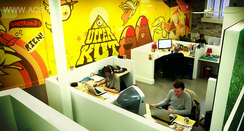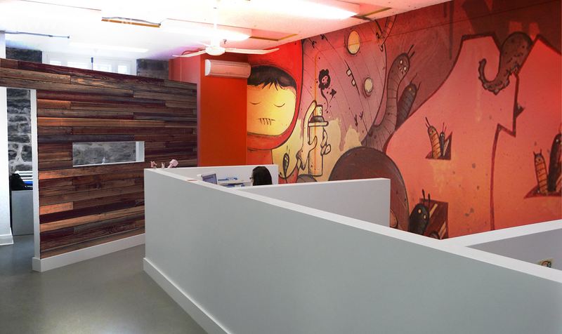德莱萨德将该机构网页上的关于艺术收藏与图形元素相结合的概念融入进了这个办公室的墙上。德莱萨德指出:“我们想创造一个充满着Upperkut机构日复一日所做事情的空间。”这也是将网站上出现的图形与设计搬到了工作室和项目经理区的原因。
