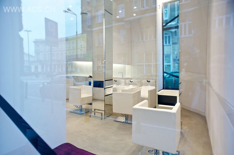 整个设计基于一个非常简单的理念,其灵感来自于剪发时碎发掉落而形成的锯齿或是带角状形态。碎发落在地面后自由而随意组合出而成的几何形态将被充分运用在整个空间中,以此打造出一种动态而活跃的氛围。这个理发店还被赋予了第二个功能,即作为一些年轻服装设计师们的展厅,所有的服装都由波兰知名设计师Gosia Baczynska亲自挑选。试衣间隐藏在幕墙之后,将零售与理发区分开。斜置墙板在中部被平行一分为二,成为一个开放式橱窗,展示一些护发相关产品。