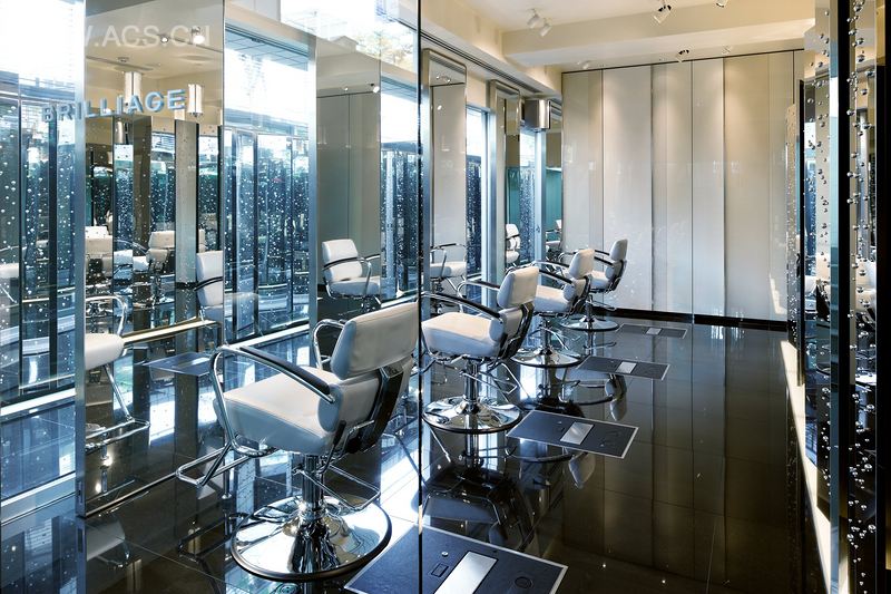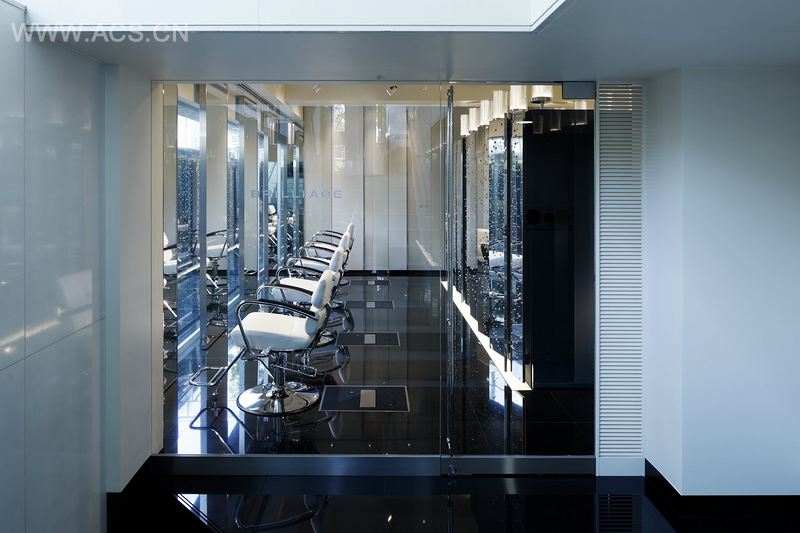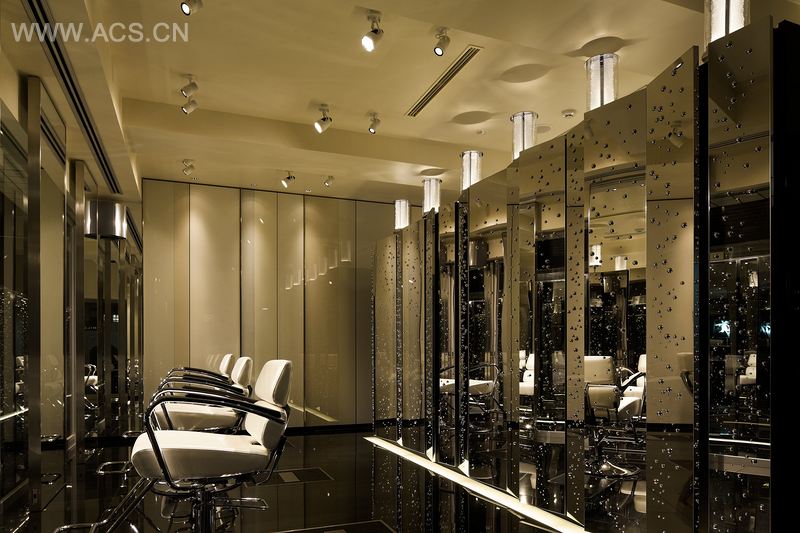 这种纯净在理发台上尤为明显。无数的圆形双头螺柱钉在镜面上,背面是抛光的不锈钢材。这些螺柱就像气泡浮在水上,并经由其他镜面反射成更多的气泡,成就一番非凡空间感观。