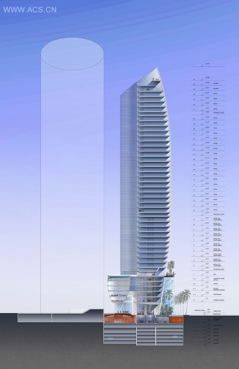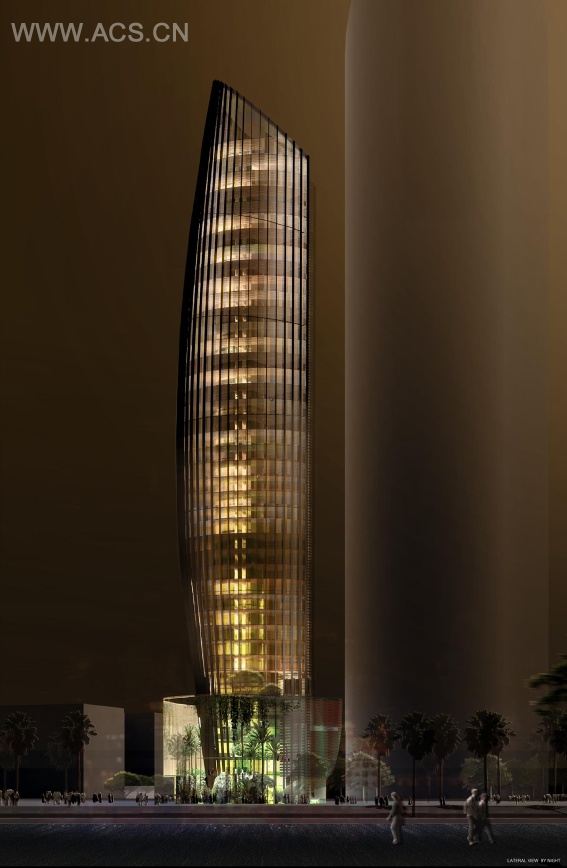安曼罗塔纳,位于阿布达利发展区IT区域,是三座主塔中的其中一座,将成为安曼新城区的标志性建筑。跟其相邻的两座写字塔楼相比,它具有独特的外形,在视觉上直观地将三座塔绑在一起。酒店包括中庭、酒吧、餐厅、游泳池、冬季花园和全景贵宾休息室。对着圆形露天广场的圆柱形的建筑,赋予酒店好客的特性。较低的釉量而出现塔创建内部和外部空间之间的联系,由于播放幻灯片。它也作为与相邻的低矮建筑结。塔楼的结构由一个中央芯筒和外围网格组成,允许无结构的大跨度,展示建筑内的空间。立面的设计和用料凸显塔楼的高科技和环境特色。塔楼的外皮是用高性能遮光铝片玻璃幕墙制造的,它们的位置根据立面的太阳位置而变化。塔楼和透明裙楼之间的互动创建了一个独特氛围的迷人的空间。主入口旁边是一个种植了奇花异草室内花园。因此,酒店的内部世界,在客人一进入酒店时就展现在他们面前。