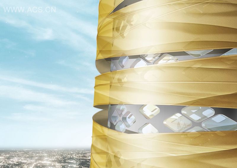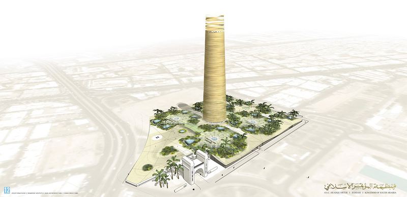 伊斯兰组织会议总部的设计作为一个这个强大的国际组织明确和杰出的象征,结合了对伊斯兰文化的深刻的理解和欣赏。综合体的的两部分,花园和塔楼,都参考了伟大的伊斯兰建筑的历史传统,同时也展现了一个壮观的包含了许多生态特征的现代结构。位于城市中心的40000平方米场所覆盖着一个浮动的、波痕屋顶,让人想起沙丘景观。162米的高塔矗立在屋顶中央,光滑的圆柱看起来好像是被金光照耀着。从远处看去,金色的多孔网状塔面日夜闪烁,成为一个象征性的灯塔。该塔设计参照了伊斯兰世界伟大的光塔。贯穿在塔楼中心的是一个伊斯兰星状的天井。中午,阳光透过天井直射下面大厅。入口大厅处一个26米高的圆顶,作为象征宇宙的一个新诠释,天花板的设计采用经典的几何星星模式。作为一个整体,花园和塔楼的交织表达了对伟大的伊斯兰文化的崇敬,同时聚焦到一个全新的、现代的视角。一个引人注目的简单的审美巧妙地融合了智能功能,为OIC打造了一个优秀的全球标志。