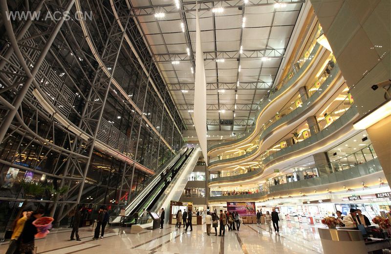 入口立面大面积玻璃的运用,可以让室内室外视线相互渗透,室内商场可以达到吸引游客达到盈利目的,室外的游客可以欣赏到自动扶梯上下承载的人群和室内物品的动静结合的室内景观。几层波浪造型的中庭栏杆设计是中庭的亮点,在高跨度的中庭中间中显得更灵动。中庭地面材质的设计,用长条形不规则地划分地面,进一步强调了人群流动的方向。