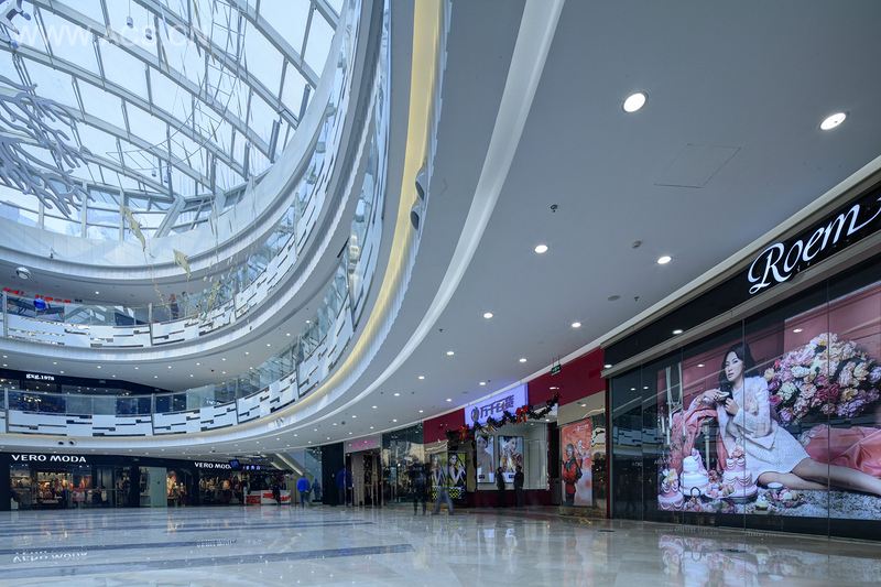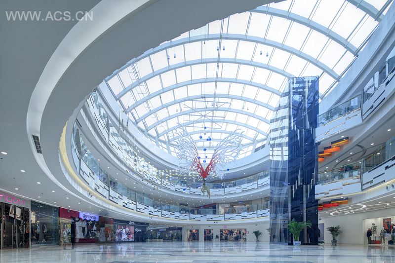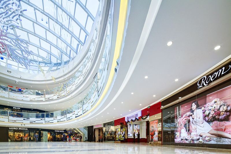 本案采用视觉丰富的构成元素,为消费者营造了一个现代时尚、气宇轩昂的商业空间。中庭运用圆弧形的设计、新颖的艺术图案玻璃和金属材料,给人以恢弘大气的空间感;透明的天幕让室内光照充沛,观光梯在阳光下闪闪发亮,流线型的图案充满了跳跃的妩媚;成群结队的热带鱼悠闲自在地遨游,灵敏的海豚欢快地跳着轻盈的舞蹈,海马在一旁怡然自得地唱着歌,让人仿佛置身于精彩纷呈的海洋世界中;圆弧形和长虹形LED管灯,在天花上灵动地滑翔,延伸出优美的轨迹;与管灯相映生辉的点点筒灯,映照在光洁的地板上,恍惚间如入“繁星渐欲迷人眼”之境。