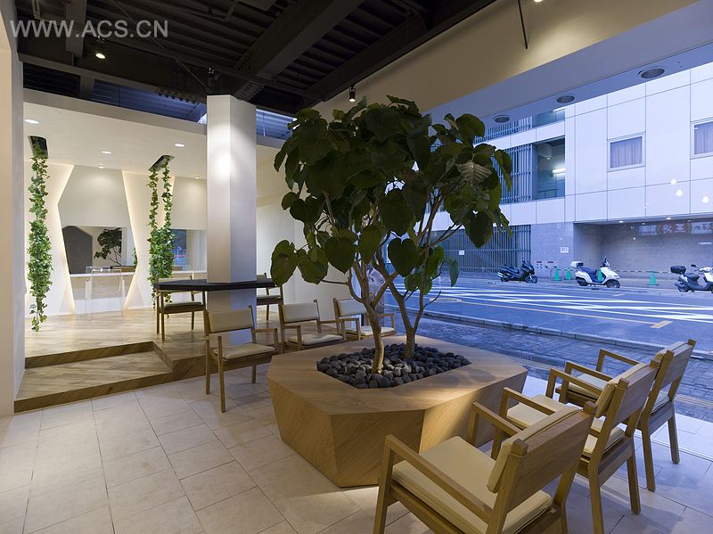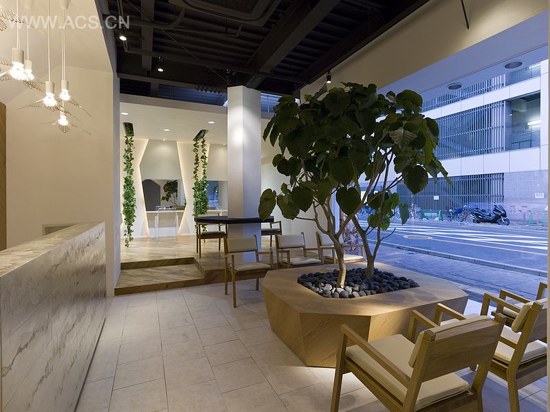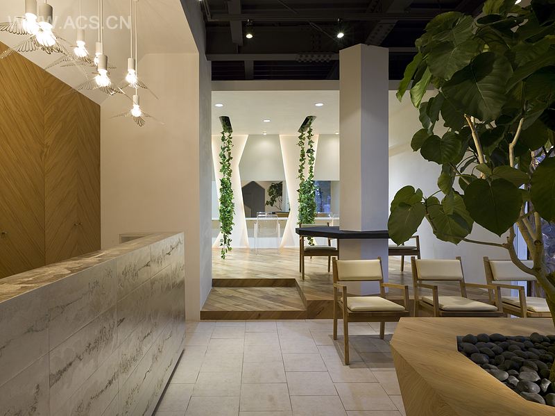 可以说整个沙龙的焦点在于树木。当顾客通过主通道进入店面时,首先看到的是一个静静伫立的青灰色前台,由金属制成,但台上似覆有一层露珠。穿过前台能看到一个矮桌,它被组合进了大型花槽中,槽中种有绿树。这给等候的顾客带来一种轻松的氛围,放佛他们正置身于树林,呼吸着清新的空气,消弭等候的不耐。至于剪发区,我想要一种相对于等候的客人而言更为私密的感觉。因此,我通过植物来进行分区,让绿色植物成为每个理发台的间隔物。这些隔挡植物被设计成从天而降的感觉,增添了一抹诗意。