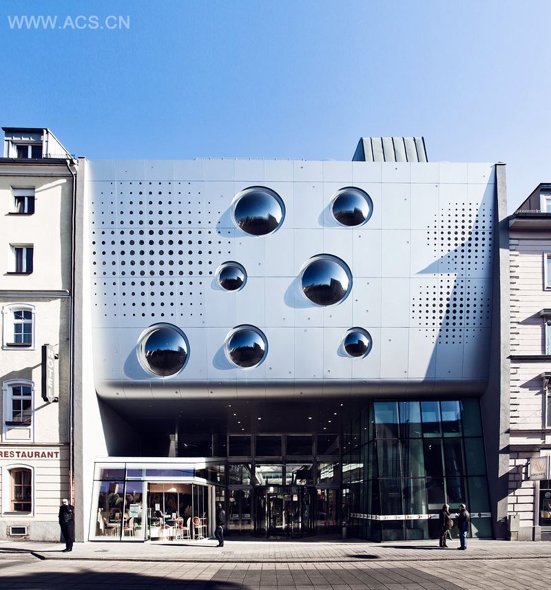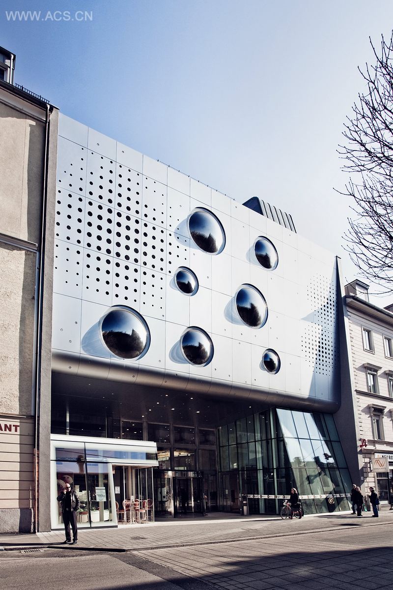这个目标通过大型银色面板和射灯搭配实现,它让人想起了星空。该建筑由4-5层的老建筑包围。从城市规划角度来看,它的外观起到了视觉上扩展现有街道空间的效果。人流从商场通向街道,而在其他一侧的观光电梯连接五个地下停车场。在建筑方面,金属幕墙外观由隔热铝复合板和钢筋混凝土结构共同打造而成。