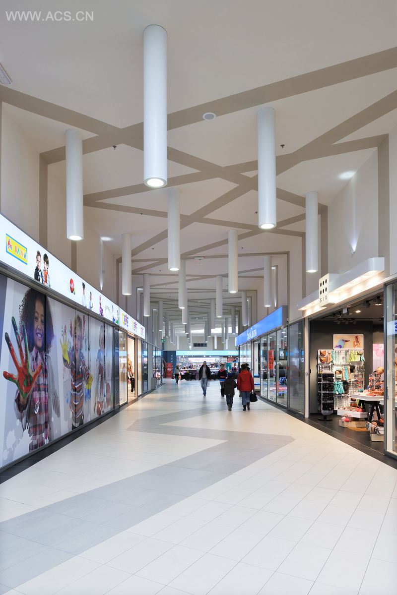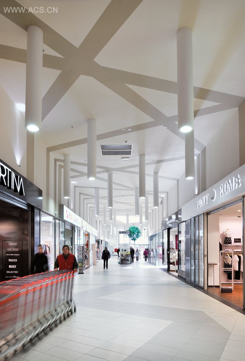 墨卡托中心位于马里博尔的人口稠密地区,因而不同于典型的郊区零售商场。它有几个入口,助于引导人流和车辆。我们致力于设计地板和天花板,为多元化空间带来建筑上的衔接。地板采用了沙色的马赛克地砖。空间以黑色材质镶边。天花板上特别设计的管状照明灯具延伸了它的空间感。商场为游客提供了良好的氛围。整个屋顶种植了绿色植物,既减弱热岛效应,又为附近居民带来了公园一般的美景。屋顶上的大量HVAC设备可以减少视觉干扰和噪声源。客户提供的工程预算有限,且期望项目建成后能耗低,这使我们不断寻求富有创造性的解决方案。而可持续设计非但没有带来限制,而成为了我们设计灵感的来源。