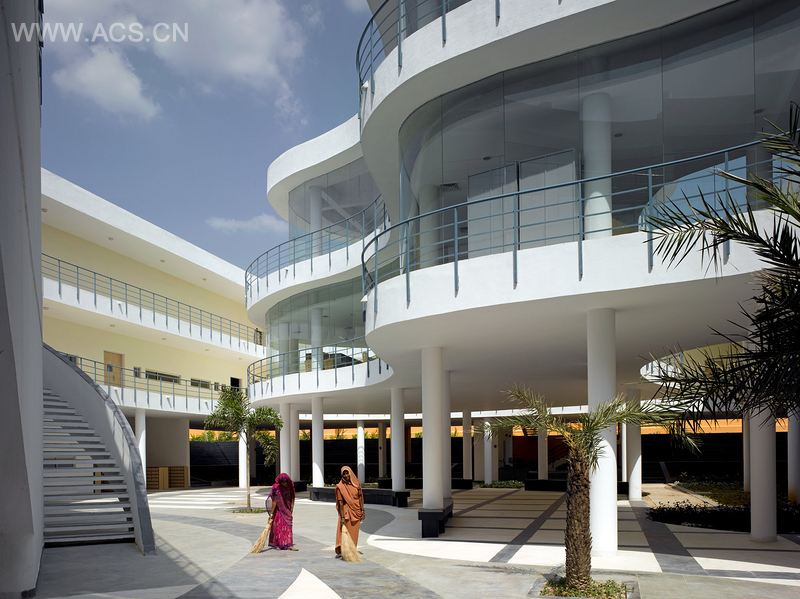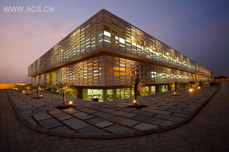 这幢建筑通过双层建筑皮层来抵御不好的天气,这种设计源自于一种传统的建筑元素,名为“加阿里”,这种设计在拉贾斯坦建筑中极为盛行。双层表层在建筑与外部环境之间充当了一种热缓冲器的功能。穿孔墙外层的密度是通过阴影分析计算出来的,它建立在建筑立面的方位基础上。外层面离建筑有4英尺远,它减少了由于开窗而导致的直接热度。流水槽贯穿了里层面,这样就能获得被动蒸发冷却的效果,以此来降低温度。