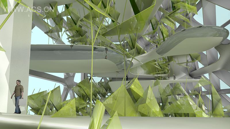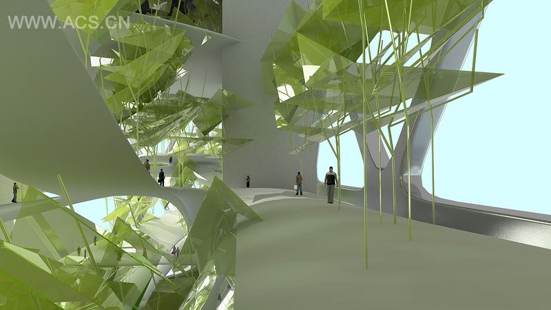在哈德逊河畔和百老汇大街建造一个468米高城市地标,如建筑创作的努力设定不因地制宜的话,就面临着让可持续发展的提议失去意义的危险,和符合人体工程学的高处生活的纲领概念。主要城市挑战来自融合这些途径和意图要超越简单公园或城市的花园,创建一个垂直花园,成为纽约名副其实的“肺”,在所有的生态方面提出设置许多不同的路径。这些纲领性方案从这个有机的建筑中提现出来,收集这个建筑的不同能指和赋予意义和生命给建筑物的高度。地面层,建筑提供了不同的商业和公共功能,在主楼里有一个购物中心和会议中心,直通主要大街和塔楼的其它设施。建筑整齐地屹立在垂直花园中,分私人住宅、高级酒店[写字楼,酒店和空中套房。