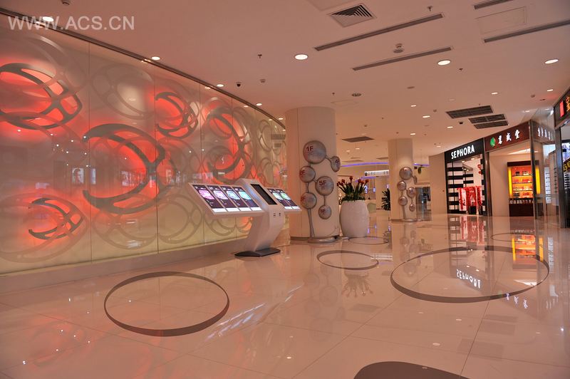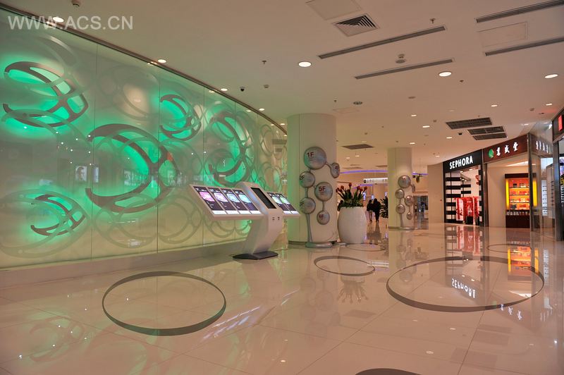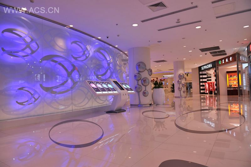 设计师在构想方案之初,就提出公共空间与众多店铺之间的形式辩证关系。因此,“纯净空间”一直坚持到完成。无论是曲线化的造型,还是象牙白的单一颜色,还包括整体照明从照度到色温,都因纯净而各个店铺产生对比。一个自始至终,坚持的灯光中的湖蓝色LED与暖米色光线的互补,使单调变得生动。受到了印象主义的启发,中庭发撒的跑马廊,每一层都在向不同方向、位置移动让空间丰富而有趣。整个空间在统一的纯净的基本上加入了水型导示牌和水生物造型的问讯台,自LOGO引申出的座椅,置入了情趣。大与小、简与繁的空间,亮与暗的灯光布置,投资的多与少、式样的选择与放弃,成为了本案一直的辩证。