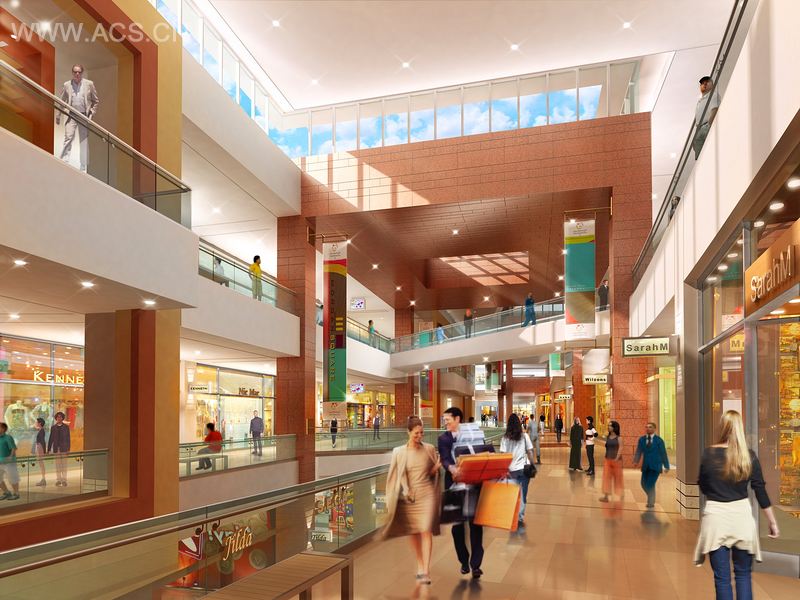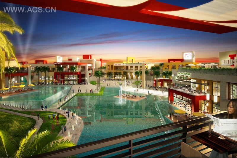 长廊的缓坡等使得这里的风景很像一个欧洲山城。它连接了入口。主入口有一座标志性的高塔。该圆柱商场为行人提供荫凉庇护。长廊本身郁郁葱葱,有着大片绿化带和供顾客休息的庭院和露台。头顶五彩缤纷的灯光和街上的檐篷营造了节日的气氛。