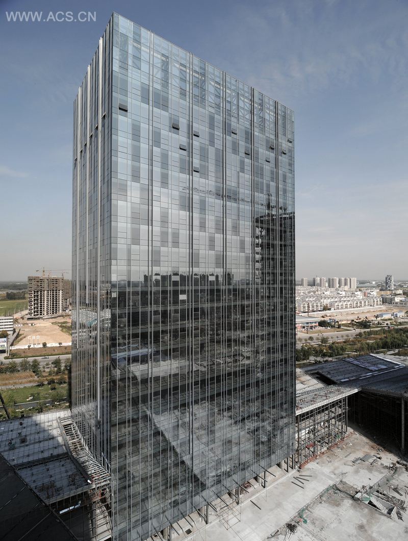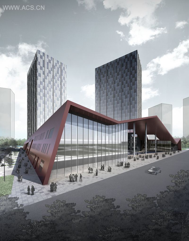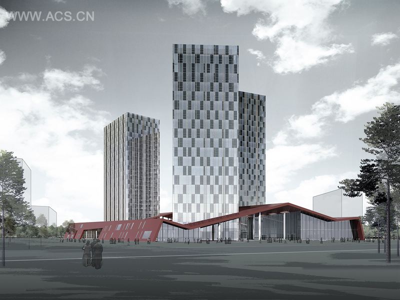 三栋塔楼像瞬间而起的水晶,创建了三个高度不同的元素。建筑设计的垂直方向让建筑外观连绵起伏–如同要长到天空中一样。该项目包括三个主要因素:大红屋顶覆盖的零售和服务设施的裙楼,三栋高层塔楼,银行和SOHO写字楼,和一个封闭的停车场。裙楼上的红屋顶重新诠释传统中国建筑的屋顶。在里面,塔楼制定布局的各项功能,包括空中花园及天台俱乐部露台。
