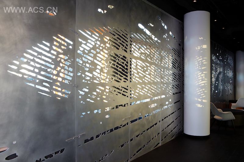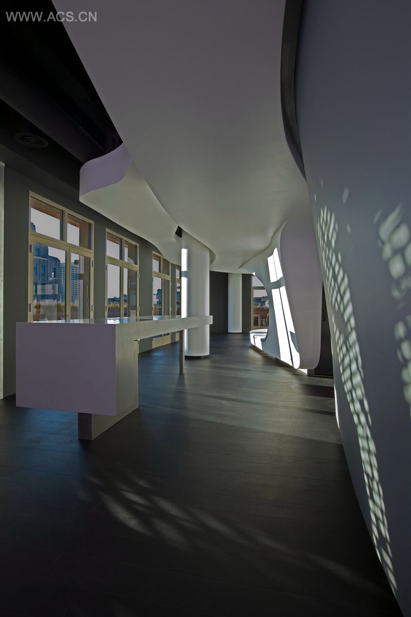一个有组织感的弯曲“脊椎”设计在这个办公室里迂回穿行。一个附属的拱腹从蜿蜒的墙面延展开来,并充当了电缆槽和机电系统的电驱。光线透过洞孔穿透了有组织感的造型面板,上面还配备了编程的LED灯。这些图案是通过动画研究而得出来的,它们被刻在了用激光切割的墙面上,并划定了室内的空间。