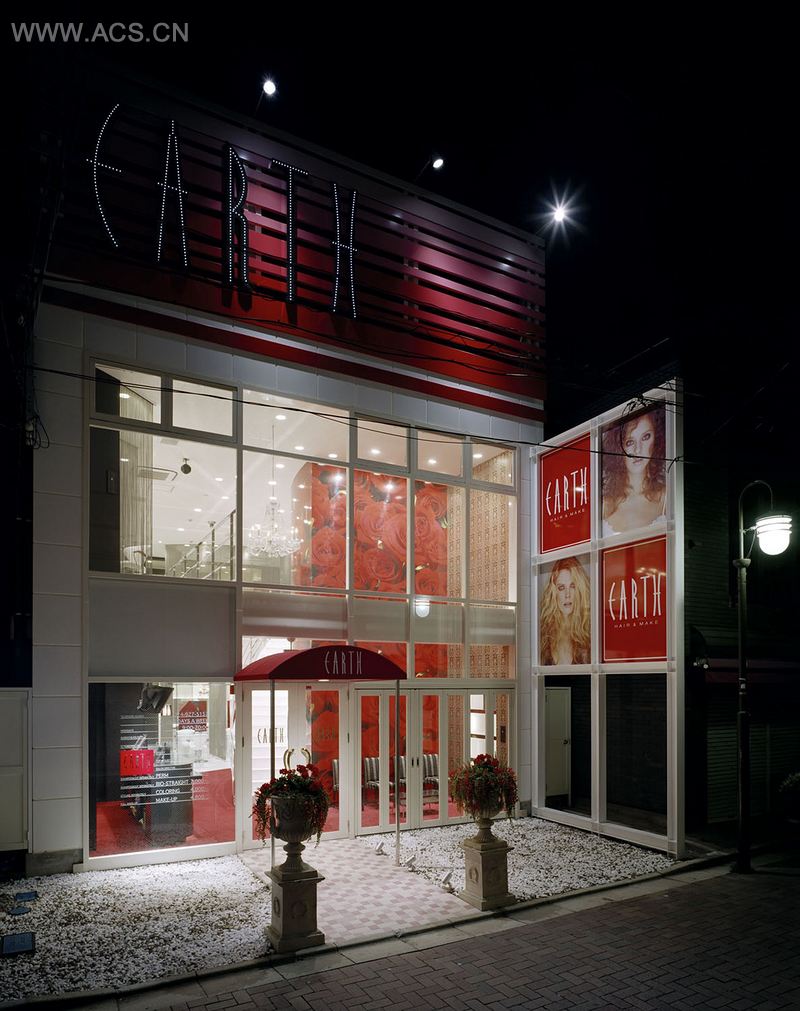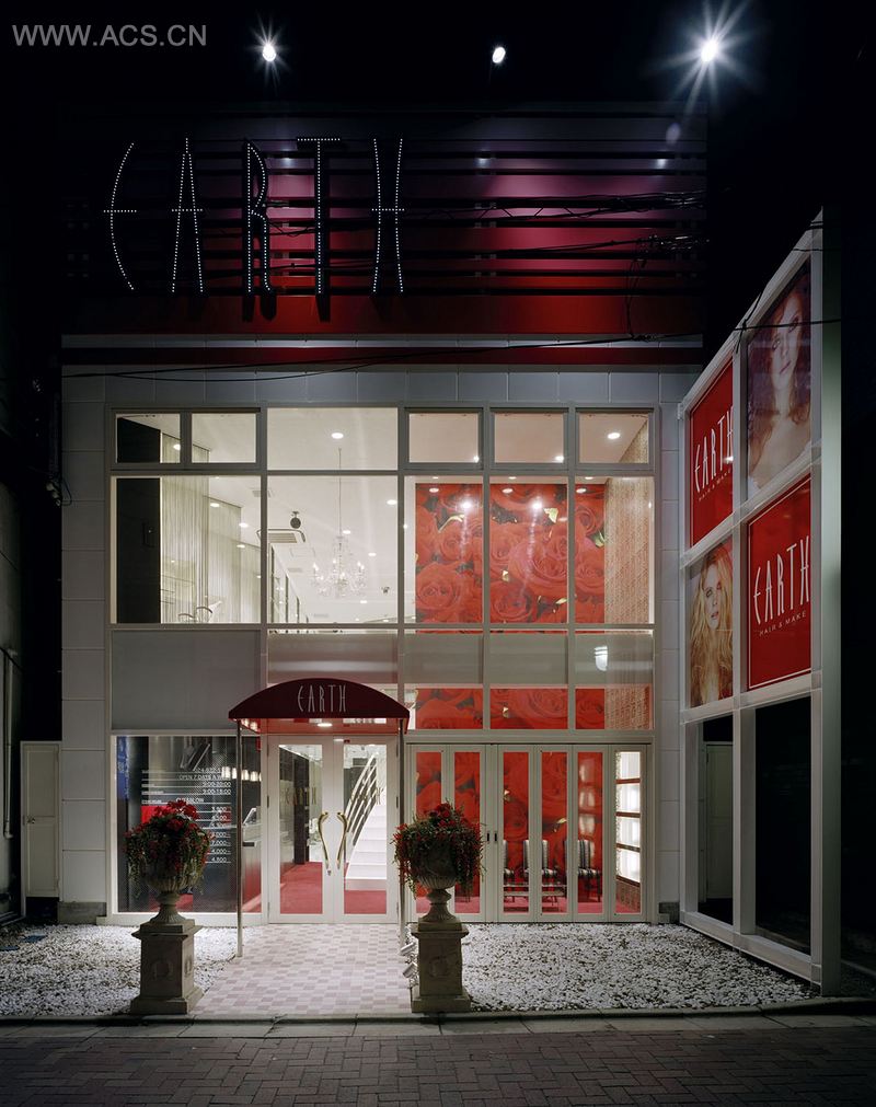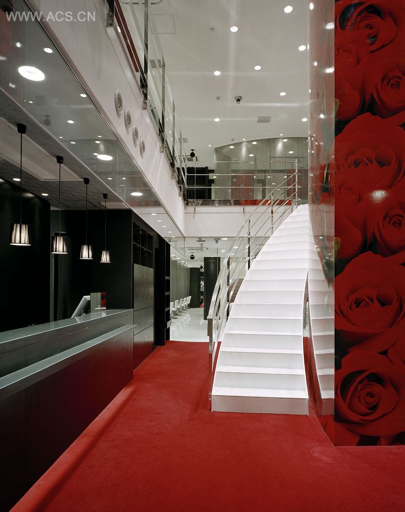 支撑楼梯的墙壁内部是VIP室。外墙表面上贴着巨幅玫瑰花图片,这是EARTH的品牌形象。 每个美发台都由线帘分隔开,保证了每个台上客人的隐私,但缺不觉完全封闭。这一系列线帘也经过特别设计。